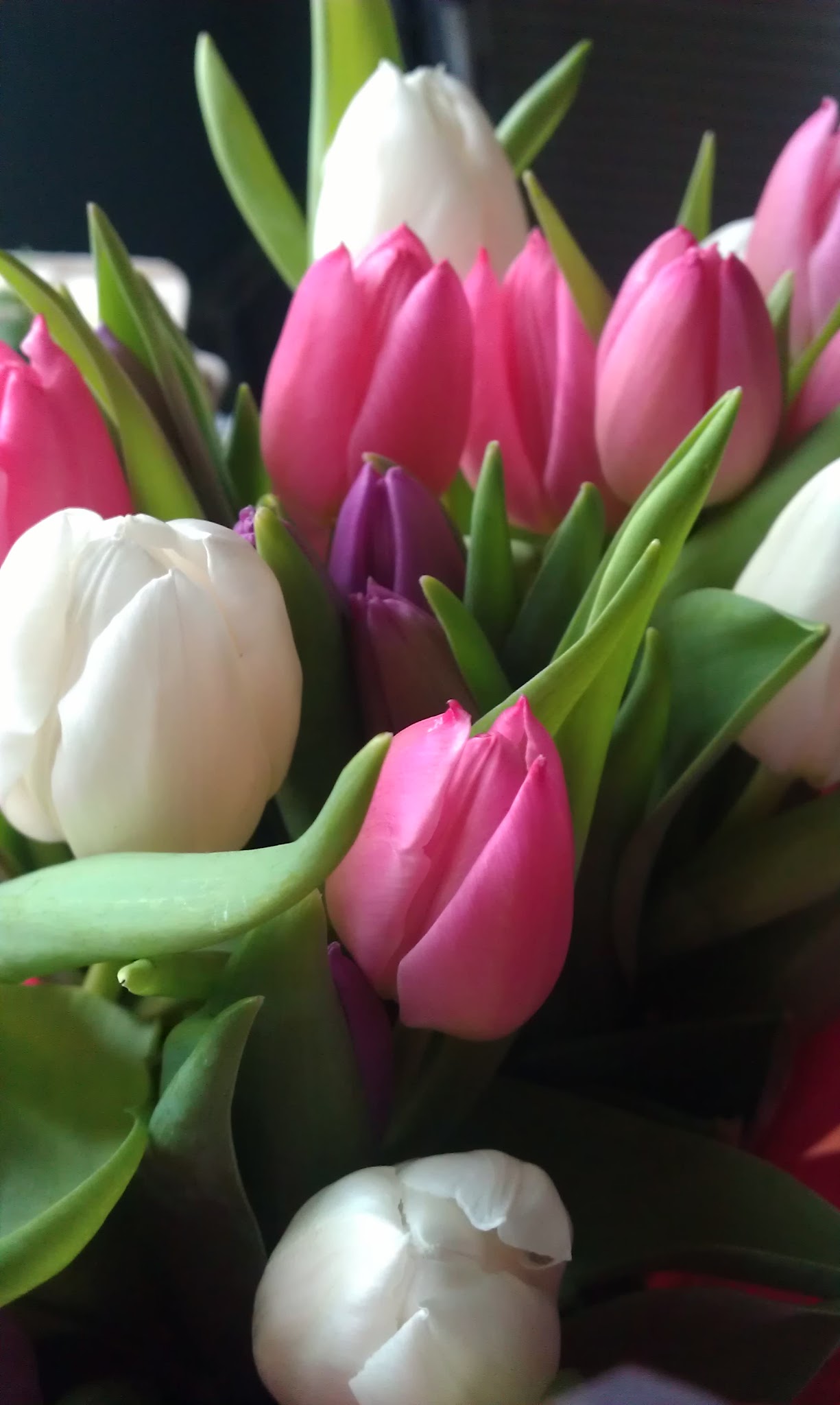 Today, when I got home with Nora after her play date with Nathaniel, there was a box of tulips waiting for me